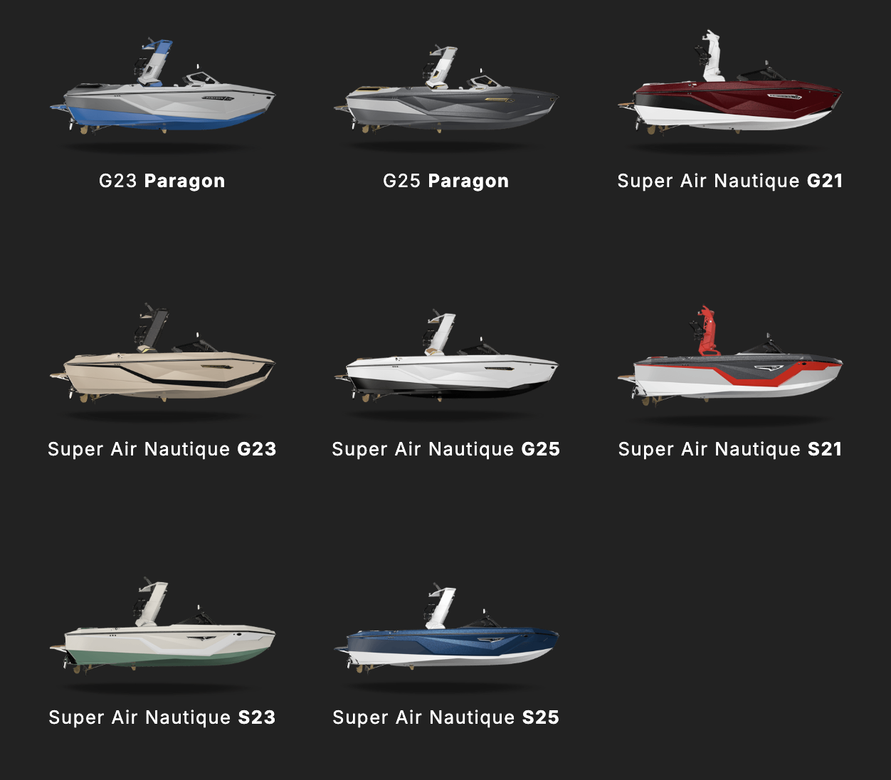 G23 Paragon · G25 Paragon · Super Air Nautique G21 · Super Air Nautique G23 · Super Air Nautique G25 · Super Air Nautique S21 · Super Air Nautique S23 · Super Air Nautique S25